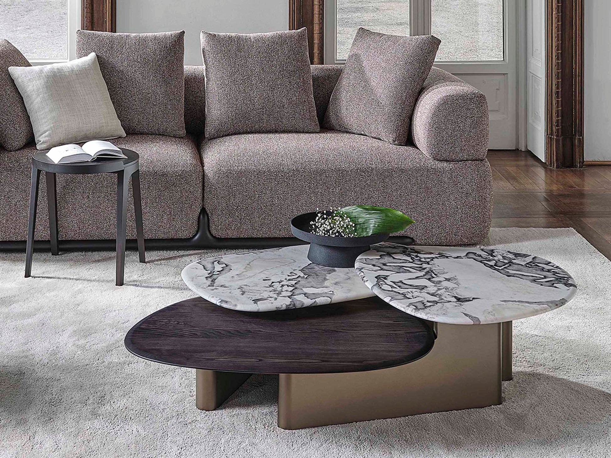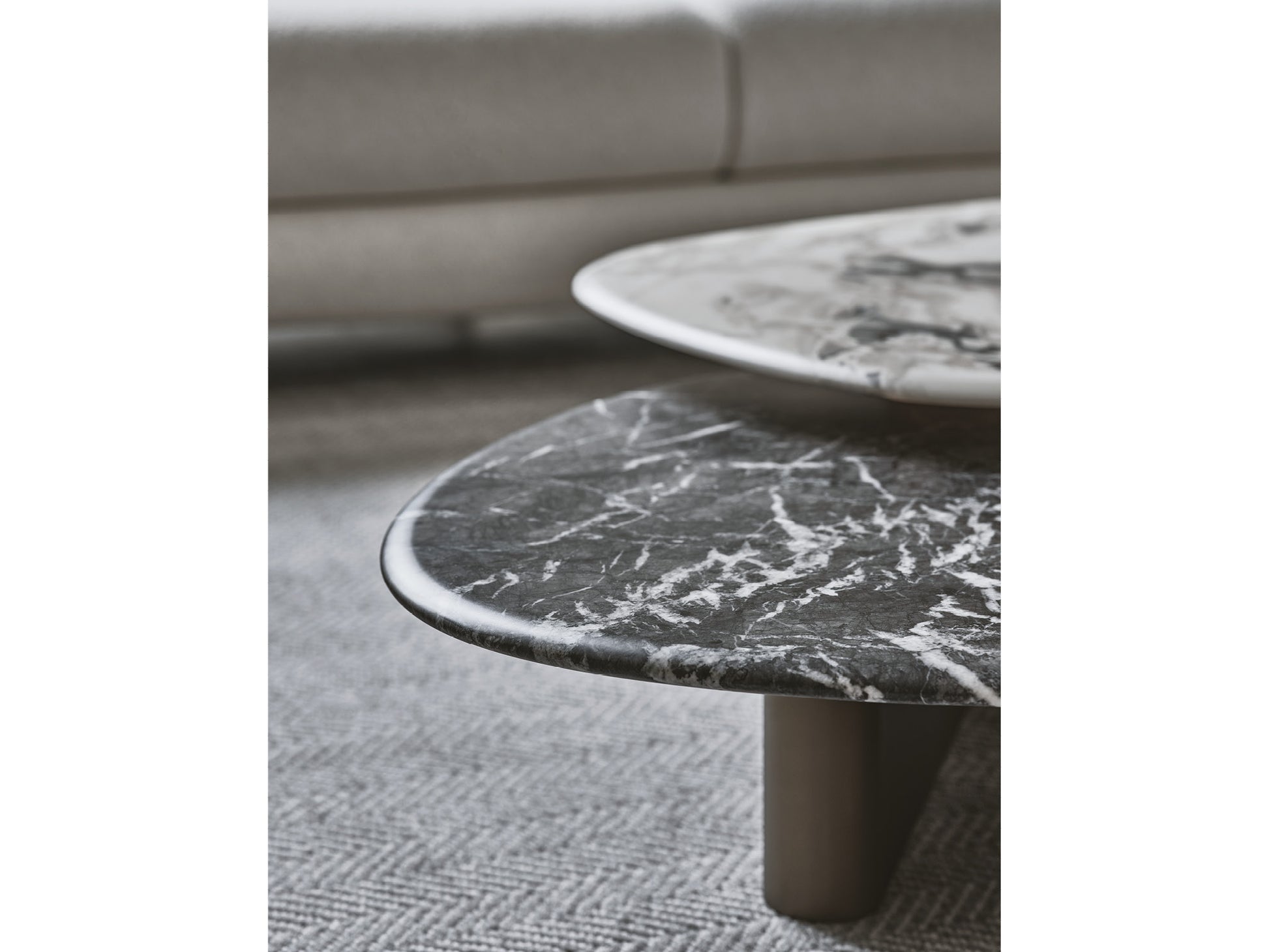 A fascinating mix of colours, shapes and materials shines through in the Callisto coffee table. It features a matt lacquered wooden base in our Bronzoro finish that accommodates three beautiful marble or wooden tops of multiple sizes. It is possible to combine different types of marble, including Grey Carnico, Imperial Rome, Lapponia Green and Dover white, or choose one single finish. The marbles vein patterns can vary, from a more pronounced grain to a more delicate one, making the combination of colours even more fascinating. The finishes available for the wooden top are natural, stained or lacquered ash.