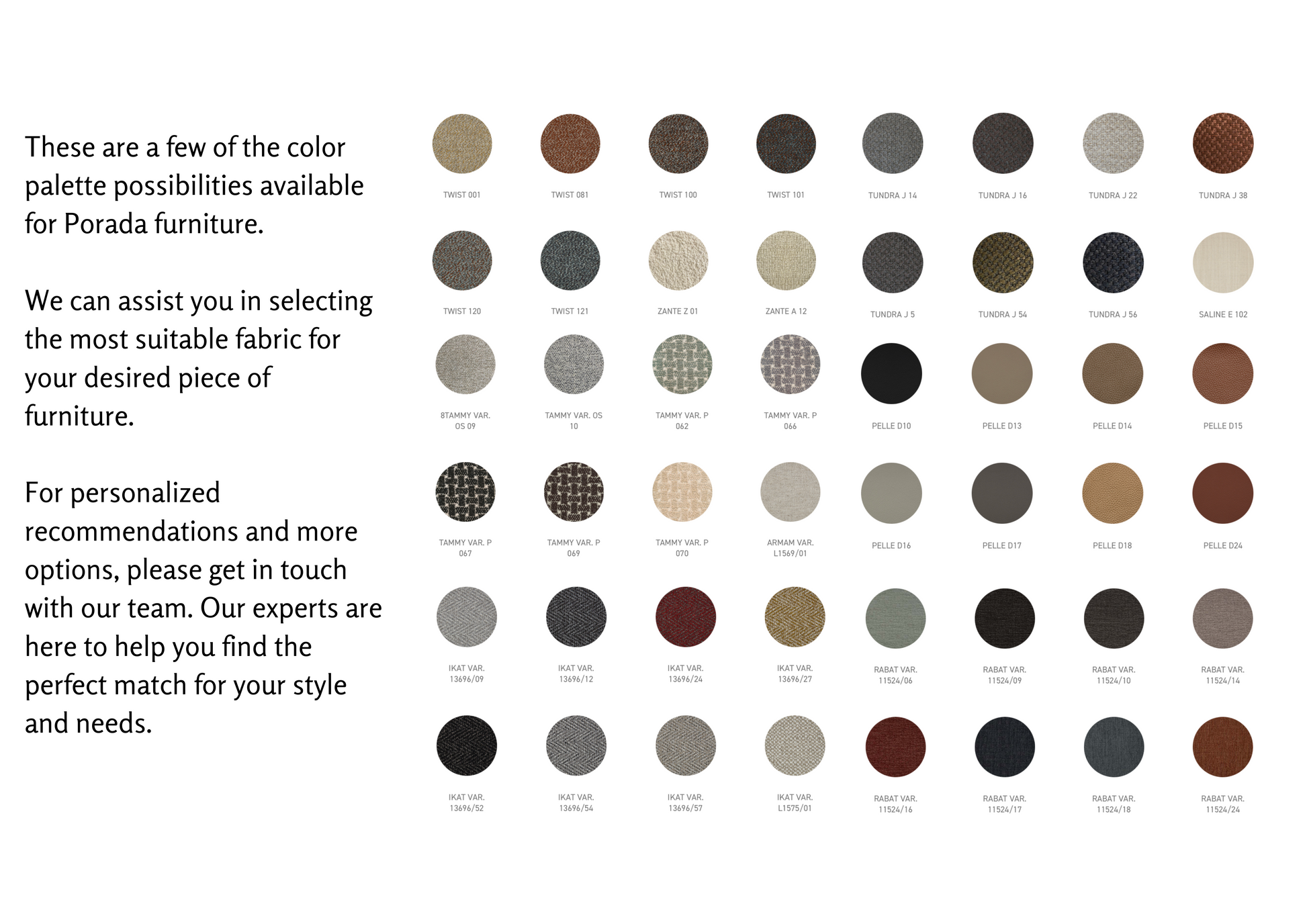 Different configurations in fabric and finishes are available. Please visit the Porada website to see all or get in touch with us.