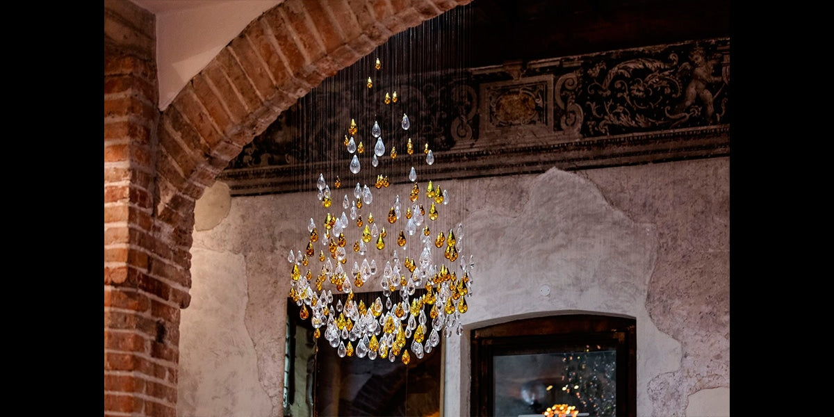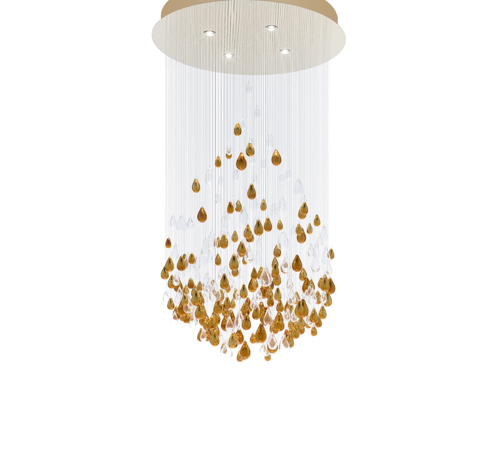 Inspired by nature, emotion, and a unique frozen moment, the Droplets Large Ceiling Sculpture captures the perfection of water collecting into a drop. This lighting sculpture, with its gold glass and titanium gold mirror coating, plays with the magic of water, air, and gravity. The harmonious density gradient highlights the instant, providing sensations of depth and motion.