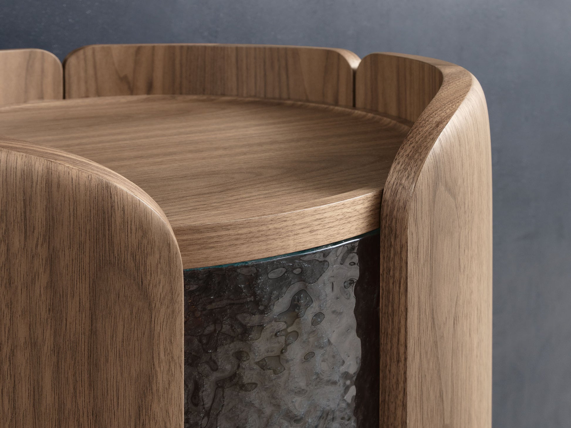 This furnishing item is characterised by rounded and thin shapes. Its slender figure with a cylindrical shape, made of Canaletta walnut wood, is composed of two main parts. The base has a storage space equipped with a wooden shelf, while the four carved petals in walnut, assembled around an iced glass plate, give a total unexpected look to the central element.