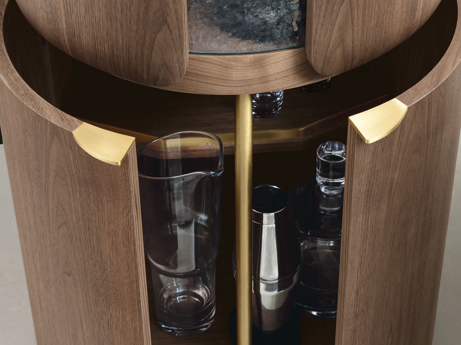 When closed, this elegant bar cabinet subtly reveals its contents, while once opened, the interior compartment brightens up thanks to a USB-rechargeable led lighting with human presence sensor. Brushed brass details and backdrop add a touch of brightness to this cabinet.