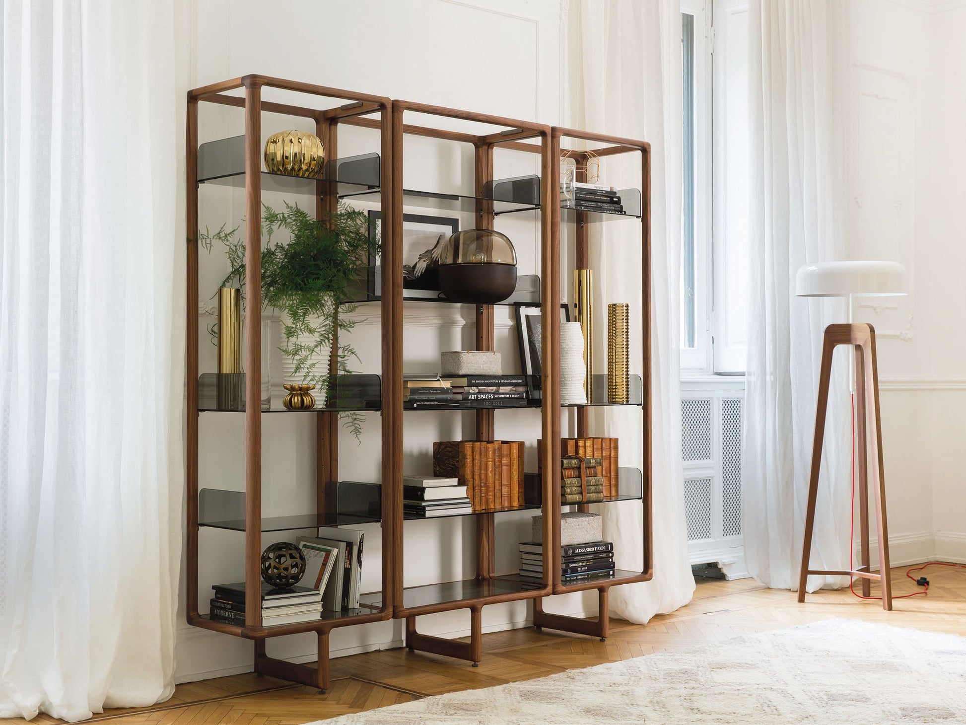 Simplicity turns into eternal beauty in this unique piece. Designed by David Dolcini, the Myria open bookcase is the perfect furnishing accessory for both domestic and contract projects. The structure, made entirely of solid Canaletta walnut, the iconic wood of Porada, also available in Moka or
