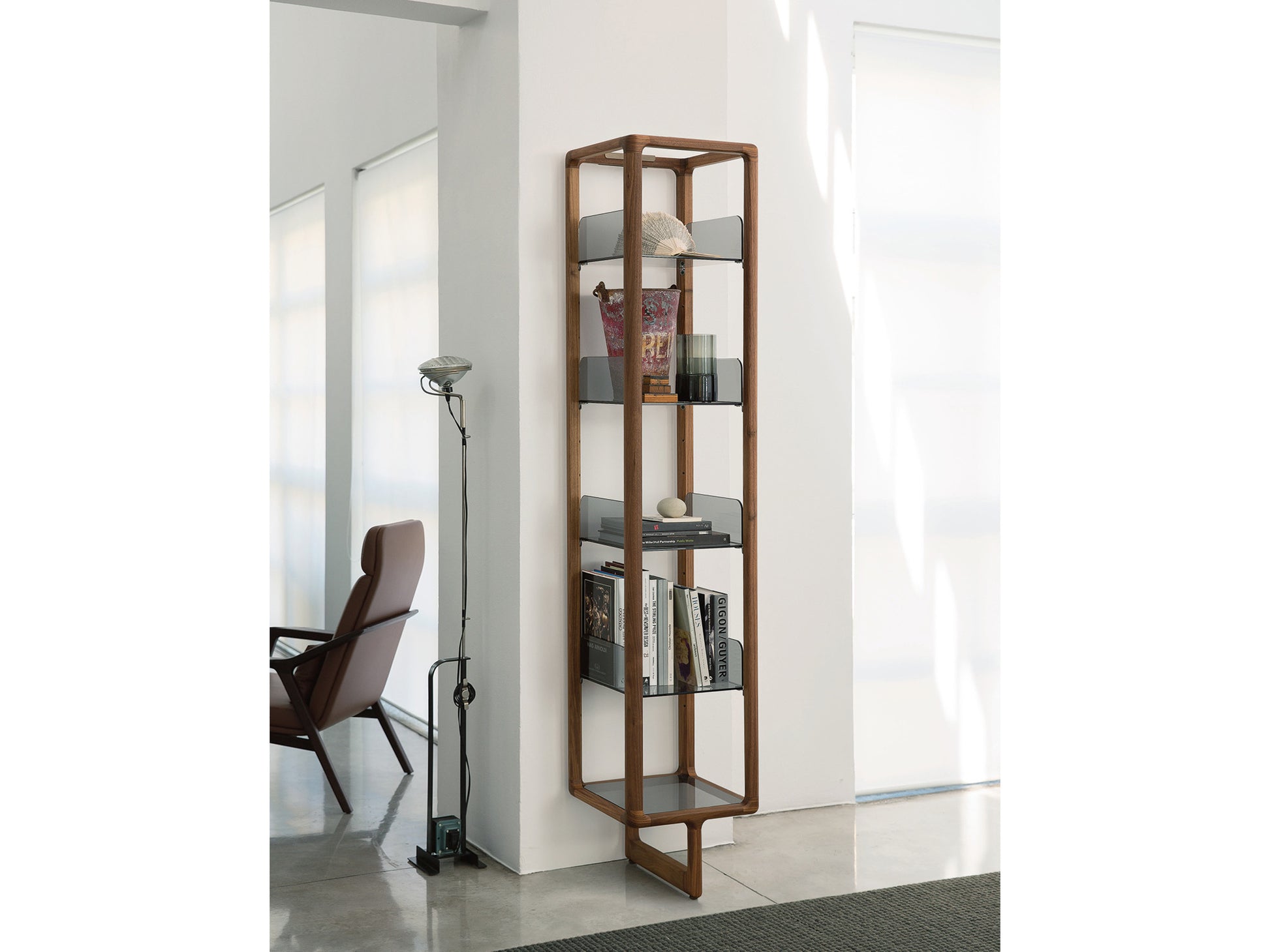 Wengé stained, is completed by a series of tempered smoked glass shelves, with or without splashbacks. This minimalist bookcase can be used individually with wall fixing, or by combining several modules, even of different widths (40, 60 or 80 cm).