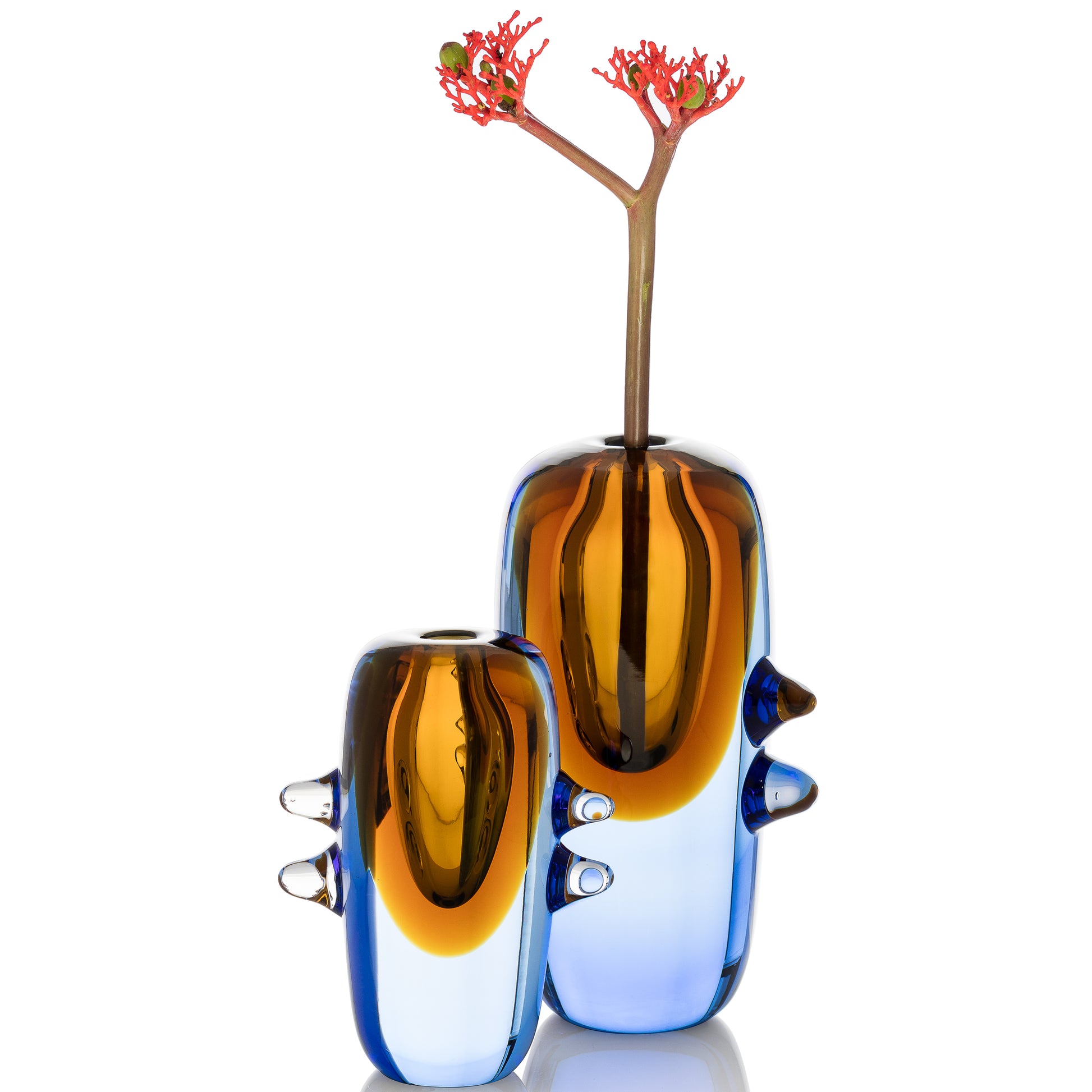 When creating the Papilla vases, artist Vladislav Urban was guided by the inherent beauty of the glass. Initially designed during the golden era of metallurgical glass in the 1960s, Lasvit has revitalized these timeless designs. The hand-blown, massive glass pieces feature a robust yet tender and romantic appearance. Named Papilla due to their round protrusions, each vase is crafted from a combination of crystal and stained golden-brown glass, glazed with a pastel-blue finish.