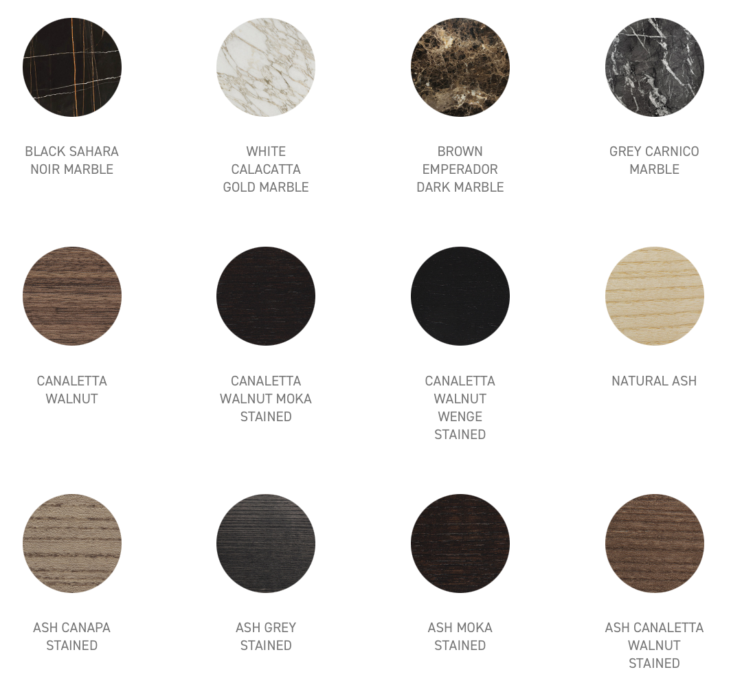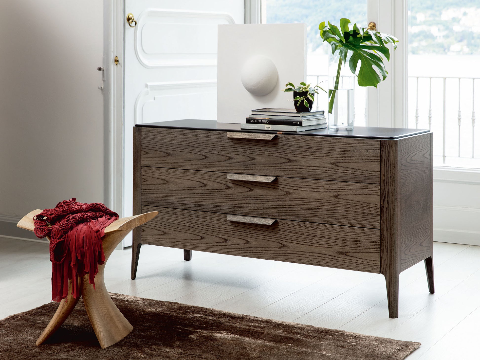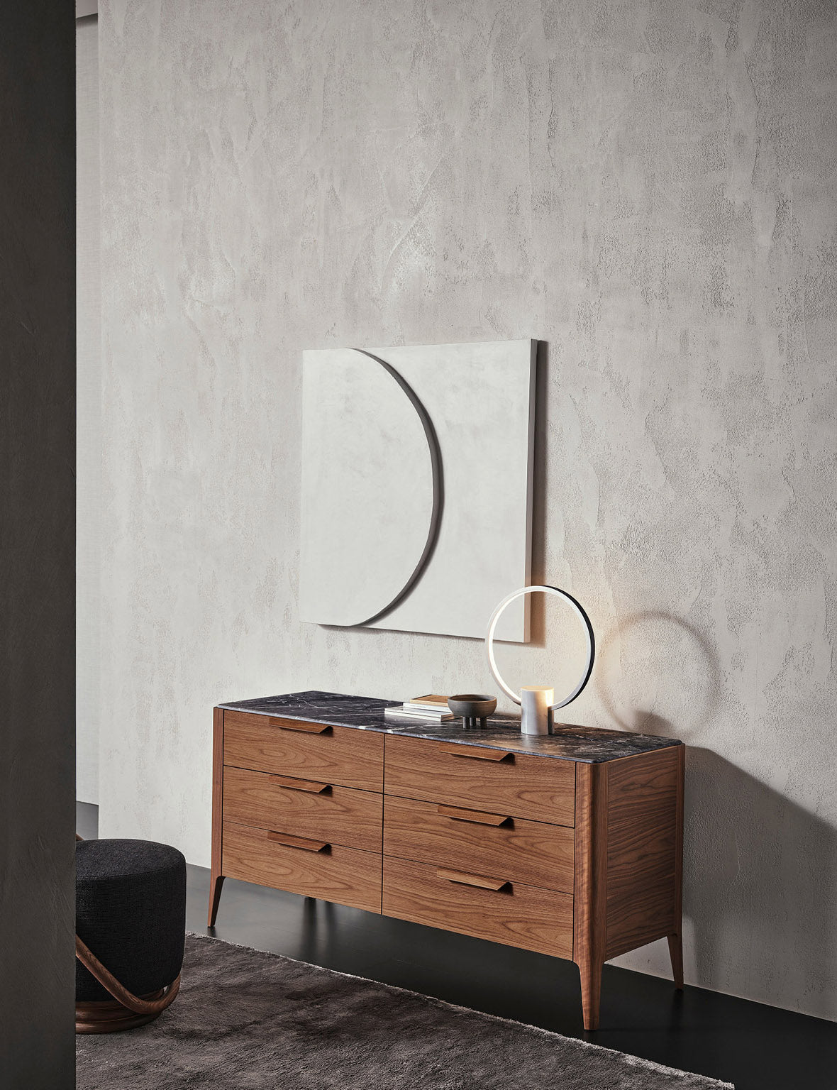 The wood grains, clearly visible on the legs and on the structure of drawers, convey a natural and genuine look. Thanks to the marble, wood or frosted back lacquered glass tops, the wooden chests of drawers, with 4 or 8 drawers, and the nightstands Ziggy night are extremely versatile and able to adapt perfectly both to elegant settings and bedrooms or living spaces with a more minimalist style.